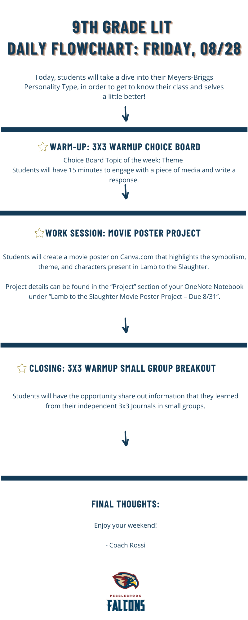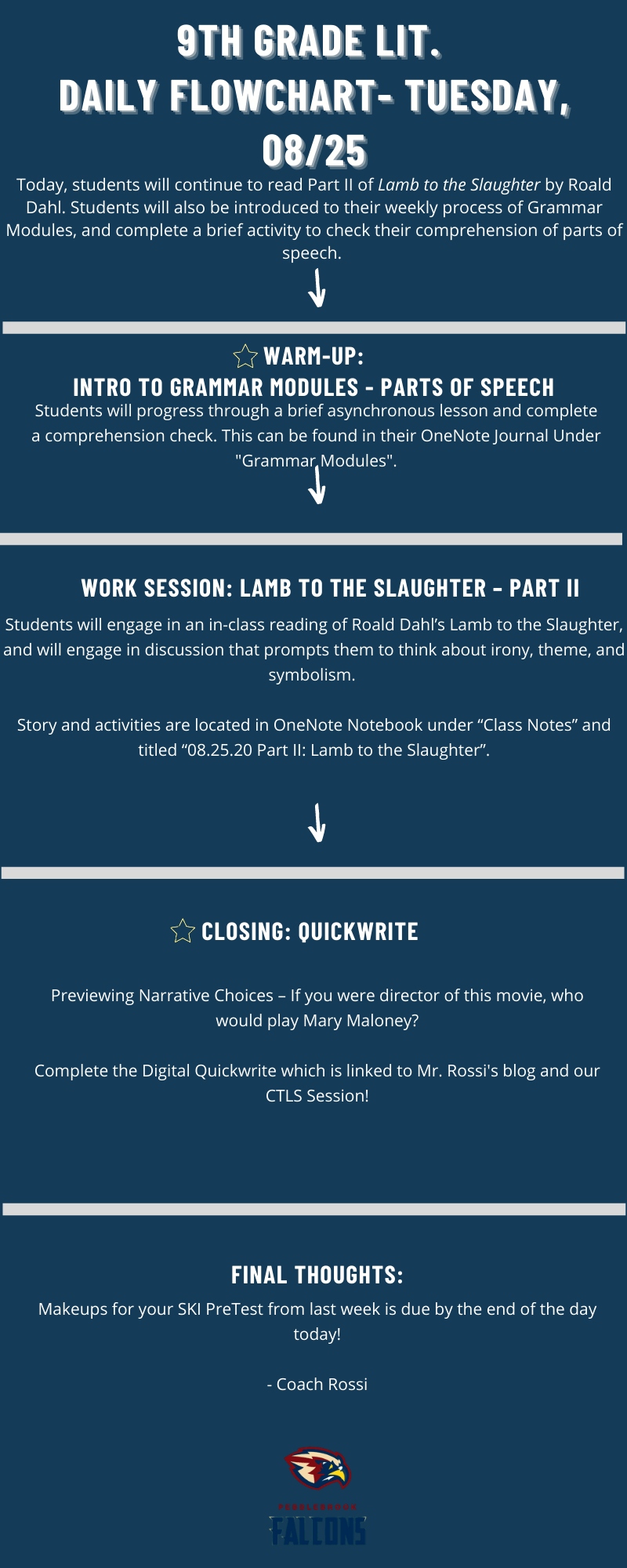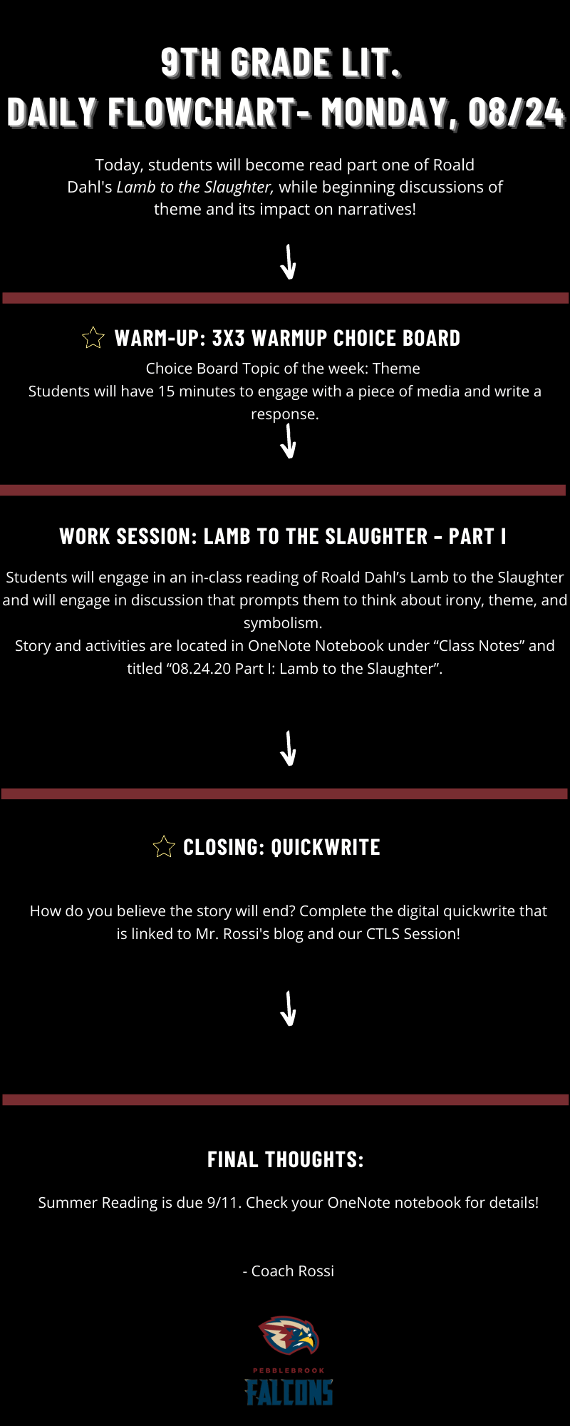 Students will create a movie poster on Canva.com that highlights the symbolism, theme, and characters present in Lamb to the Slaughter. Project details can be found in the “Project” section of your OneNote Notebook under “Lamb to the Slaughter Movie Poster Project – Due 8/31”.